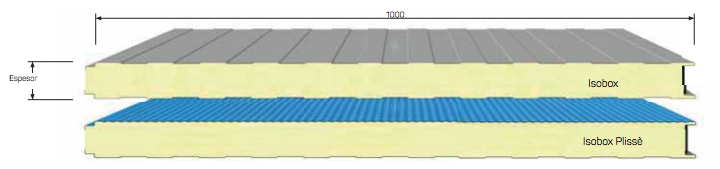 Panel de fachada de doble revestimiento metálico con aislamiento en poliuretano. La junta, con encastre machi-hembrado, es a vista, con tornillo pasante.